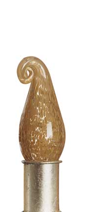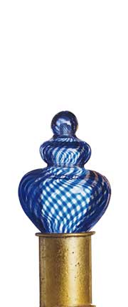 Evocative of Murano glass, the collection incorporates techniques of Venetian glass making such as fazzoletti (clear), latticino (white strings), and sommerso (saturated color). The finials are complimented by, and set off with, detailed metal collars in hand finishes of natural and rusted steel, copper and gold leaf, and verdigris. The finials were awarded a Roscoe for design excellence in May of 1993.
