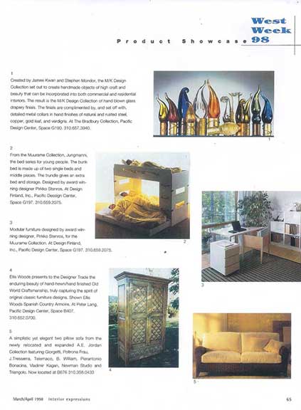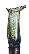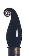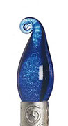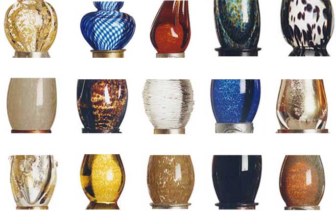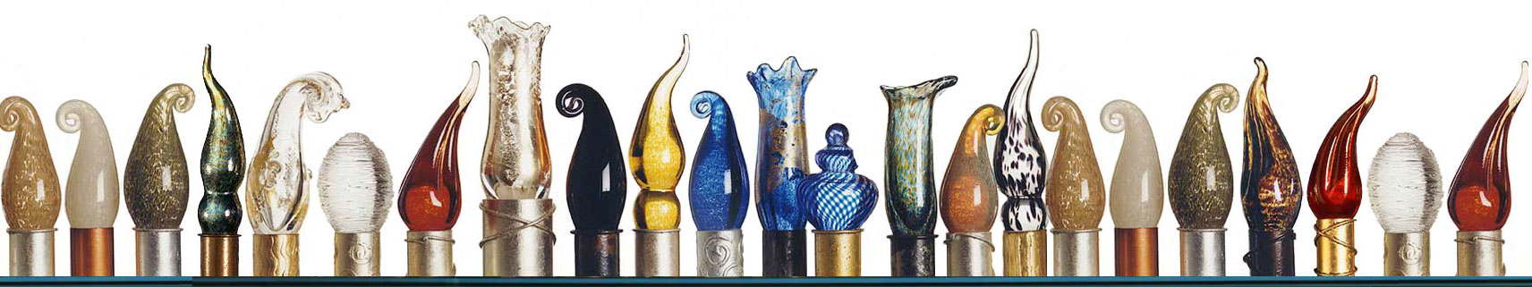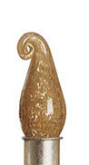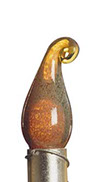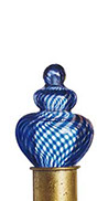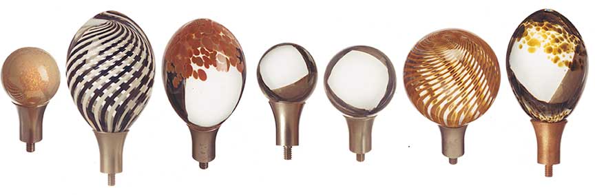 Evocative of Murano glass, the collection incorporates techniques of Venetian glass making such as fazzoletti (clear), latticino (white strings), and sommerso (saturated color). The finials are complimented by, and set off with, detailed metal collars in hand finishes of natural and rusted steel, copper and gold leaf, and verdigris. The finials were awarded a Roscoe for design excellence in May of 1993.