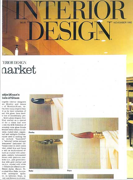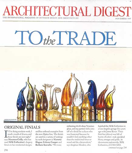 Created by design partners James Kwan and Leo Mondor, the M/K Collection Inc. marks the team’s first essay into the home furnishing market. James and Stephen set out to create handmade objects of high craft and beauty that can be incorporated into both commercial and residential interiors. The result is the M/K Collection of hand blown glass drapery finials.
